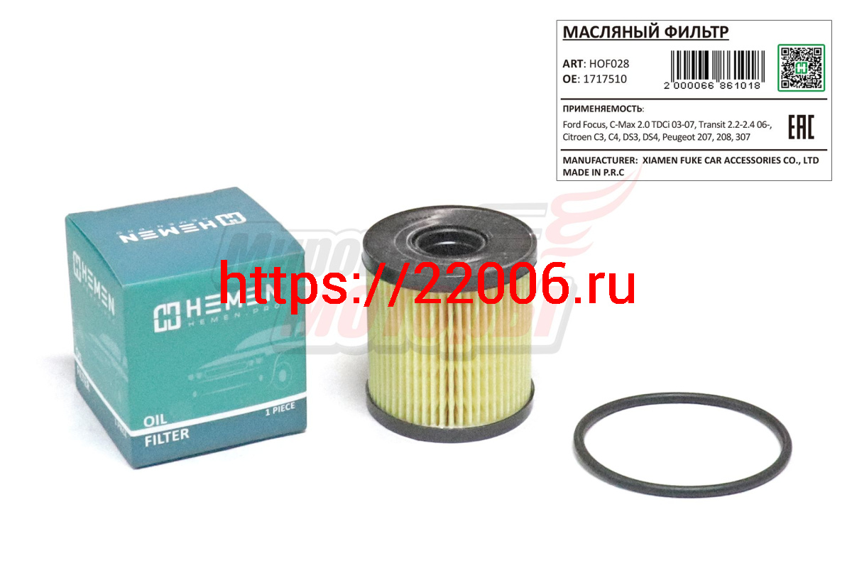 - Фильтр масляный Ford Focus, C-Max 2.0 TDCi 03-07, Transit 2.2-2.4 06-, Citroen C3, C4, DS3, DS4, Peugeot 207, 208, 307 (HOF028) в Ставрополе недорого